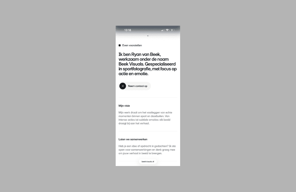 BeekVisuals had behoefte aan een professionele online portfolio waarin zijn fotografie centraal staat en zijn werk overtuigend gepresenteerd wordt aan potentiële klanten. Ik ontwierp en ontwikkelde een minimalistische website in Framer die de focus volledig op beeld legt, met een rustige uitstraling en een duidelijke contactflow.